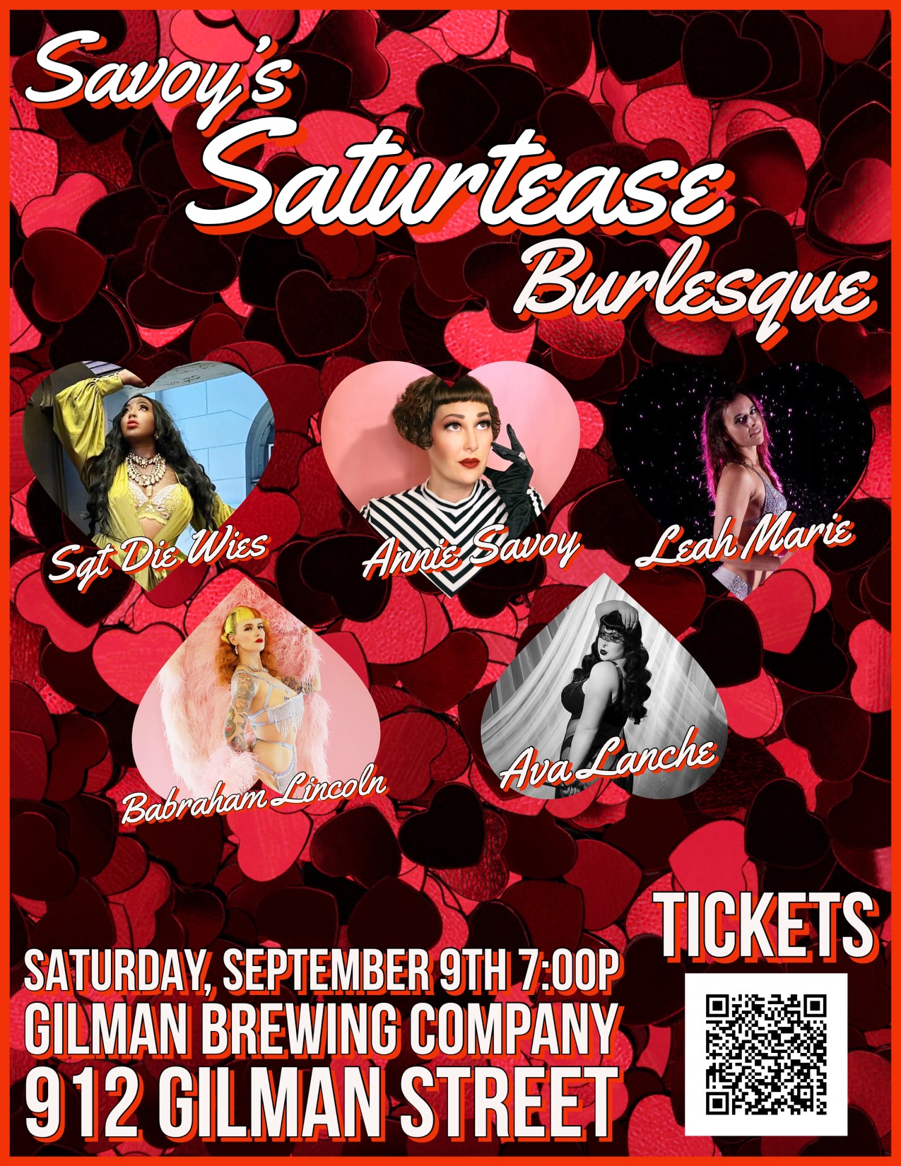We’re so excited to be partnering with performer Annie Savoy for Gilman Brewing’s first night of burlesque! Featuring performances from Sgt Die Wies, Leah Marie, Babraham Lincoln, Ava Lanche, and Annie Savoy.