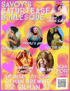 We’re so excited to be partnering with performer Annie Savoy for Gilman Brewing’s first night of burlesque! Featuring performances from Sgt Die Wies, Leah Marie, Babraham Lincoln, Ava Lanche, and Annie Savoy.