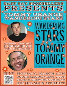 Celebrate the release of Pulitzer Prize Finalist Tommy Orange’s new novel Wandering Starsat Gilman Brewing Co on Monday, March 11th at 7:00p. The author will be in conversation with John McMurtrie, the senior editor of Zyzzyva literary journal. Presented in collaboration with East Bay Booksellers. Hosted by Brad Johnson.