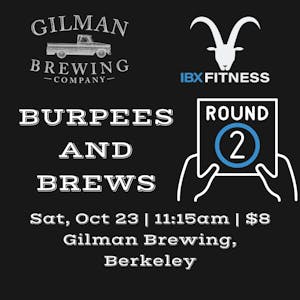 Welcome to the second Burpees & Brews from @gilmanbrewing and @ibx.fitness! We’ll meet at Gilman Brewing in Berkeley on Saturday, 10/23, event starts at 11:15 am. $8 gets you a 30-minute workout followed by a beer of your choice. Don’t worry, we won’t just do burpees, we’ll make sure you get a well-rounded workout!
