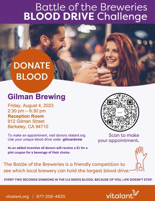Join us for the Gilman Brewing Battle of the Breweries Blood Drive Friday, August 4, 2023, from 2:30 pm to 6:30 pm in the reception room located at 912 Gilman St, Berkely Ca 94710 and step up to support patients during their time of need. Click on the link below to schedule your appointment: